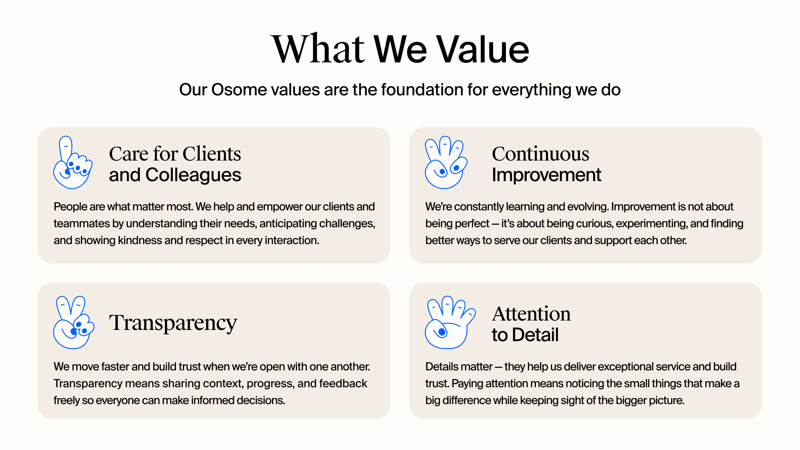 When it comes to our company culture, don't just take our word for it, let us show you. These videos explore our team behind the scenes, see how they make Osome a unique place to be.